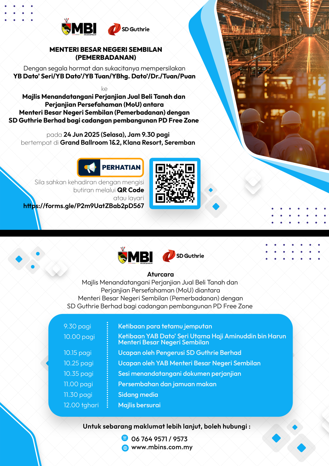 JEMPUTAN KE MAJLIS MENANDATANGANI PERJANJIAN JUAL BELI TANAH DAN PERJANJIAN PERSEFAHAMAN (MOU) BAGI CADANGAN PD FREE ZONE DI LOT 10470, MUKIM PASIR PANJANG, DAERAH PORT DICKSON DI ANTARA MENTERI BESAR NEGERI SEMBILAN (PEMERBADANAN) DENGAN SD GUTHRIE BERHAD
